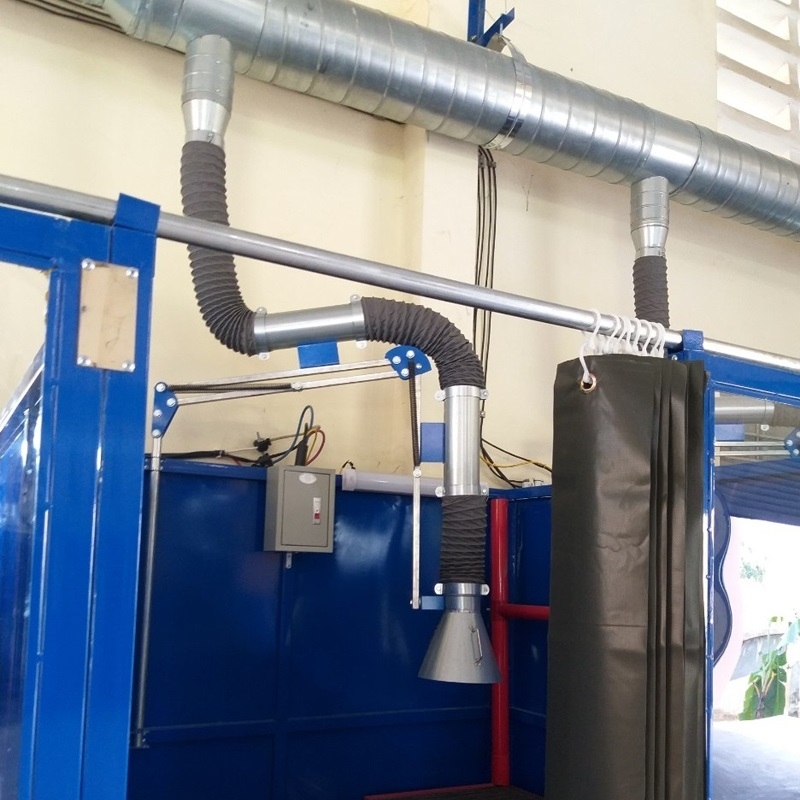 Hệ thống 05 cabin hàn 5 cabin hàn xếp liền kể theo 1 hàng (gồm: Hệ thống vách, cửa cabin, hệ thống hút khói đến từng cabin, Hệ thống điện, bản hàn, ghế hàn, đồ gá hàn)
